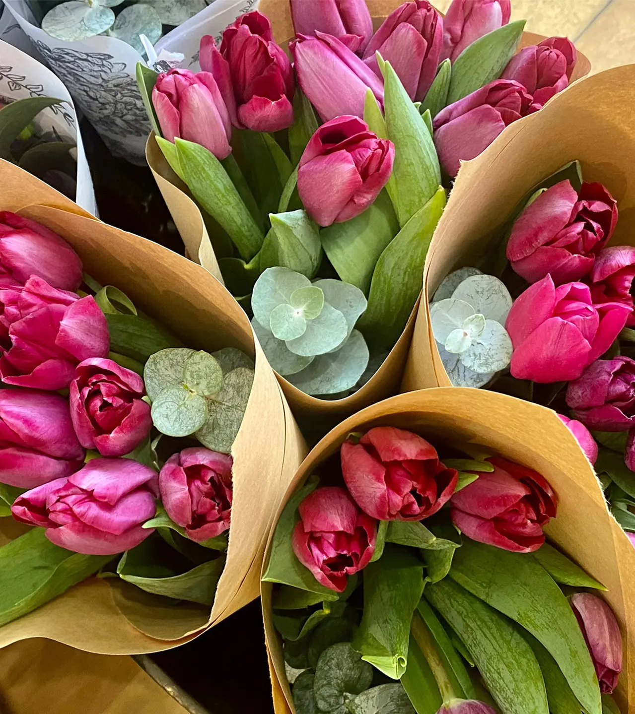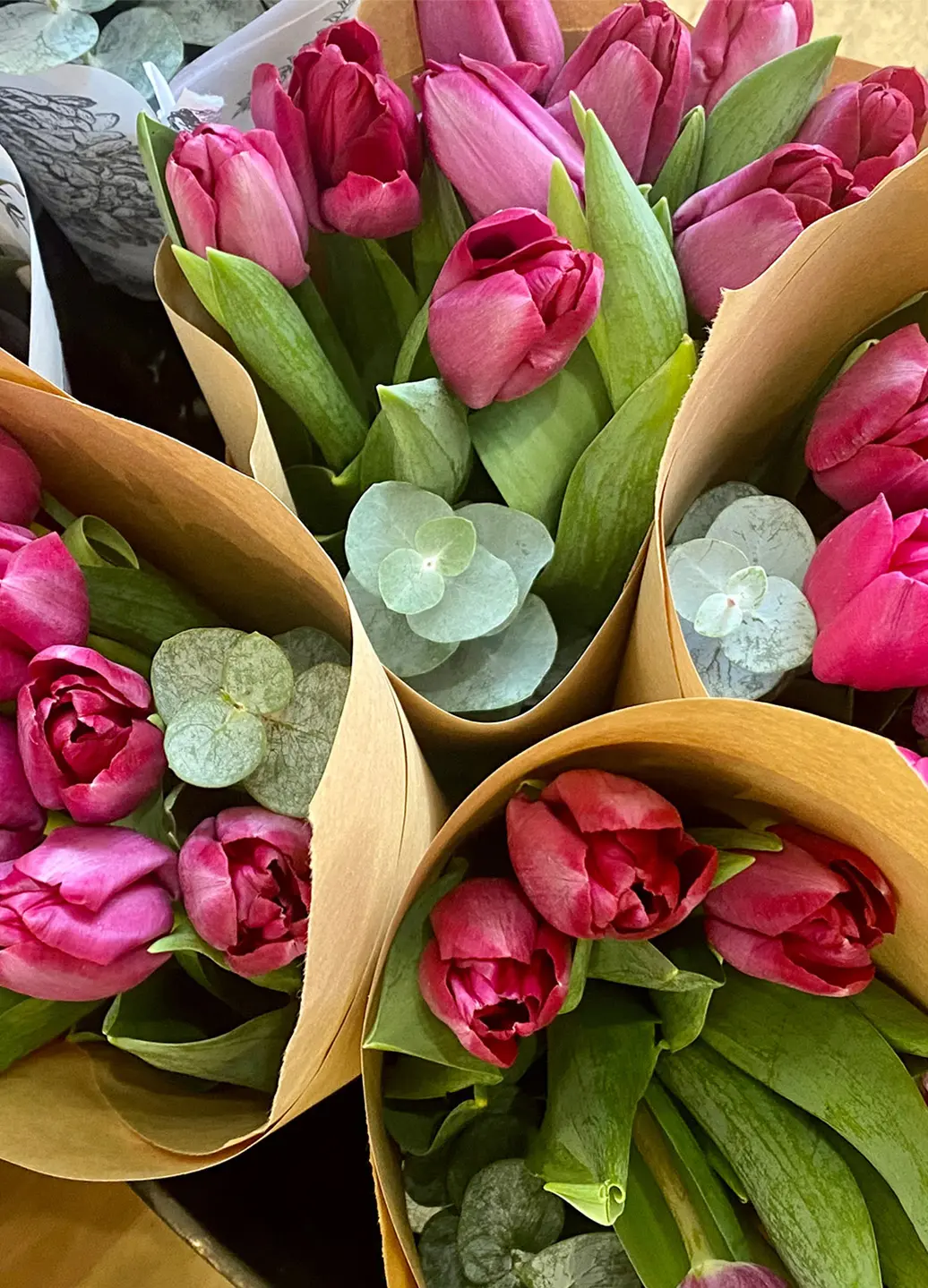 Les Champs Fleuris, au 171 avenue du Mont-Royal, offrent des bouquets faisant preuve d’une minutie et d’une créativité impressionnante. Chaque assemblage de fleurs fait sur place est simplement à couper le souffle. Bien qu’on vous conseille de commander quelques jours à l’avance, des bouquets seront disponibles en boutique et en livraison toute la fin de semaine. Leur bouquet de tulipes roses agrémentées d’eucalyptus en vaut le détour.
