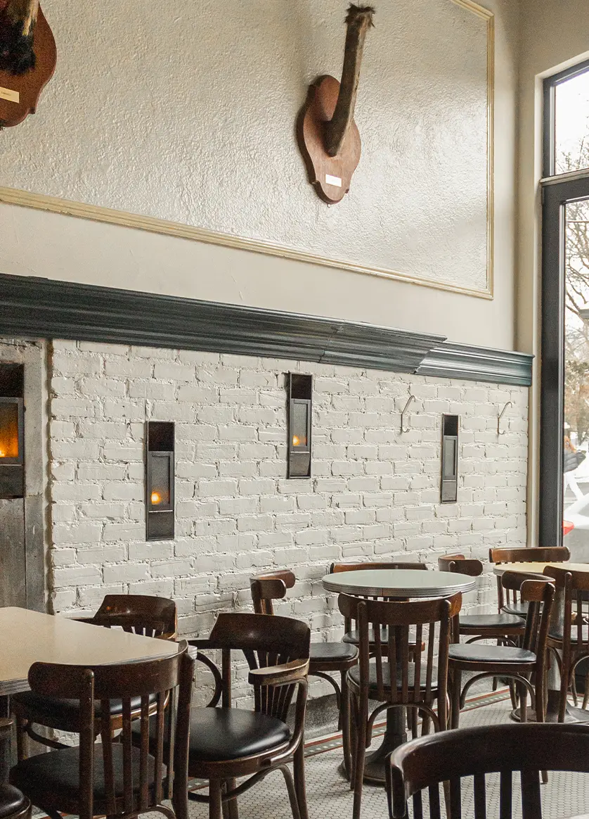 Grand symbole du Bily Kun, des trophées d’autruches ont pris place sur les murs, ils rendent hommage aux personnes qui ont participé au projet et sont devenues un logo sur les verres du bar. Pour ceux qui se demandent, non ce ne sont pas des trophées de chasse, mais bien des animaux récupérés d’un élevage de viande d’autruche québécoise, proche de Drummondville. Au lieu d’être jeté, Fabien est heureux de compter ces autruches parmi ses invités, il y en a une pour chaque collaborateur du projet.